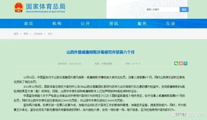 中国篮协根据《关于严格禁止体育运动中使用兴奋剂行为的规定》以及《国际篮联章程》相关规定,给予当事人威廉姆斯禁赛6个月的处罚,同时对山西中宇俱乐部主教练处以5000元罚款,对山西中宇俱乐部处以10000元罚款。