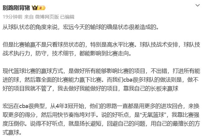 别跑刚背猪认为:从球队状态的角度来说,宏远今天的输球的确是状态很差造成的。宏远是典型的靠长板来赢球,从4年3冠开始,他们的思路一直都是用更多的进攻回合,来换取更多的得分,然后用快节奏拖垮对手。说的好听点,是“无氧篮球”,我靠比赛强度压倒你。说得不好听点,就是扬长避短,回避自己的问题,用自己的最擅长的方式赢球。