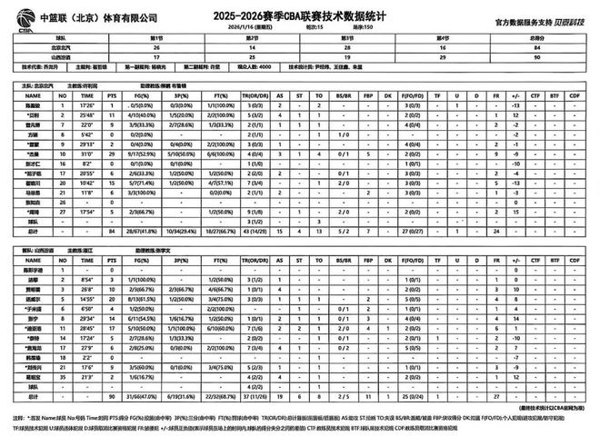 北京时间2026年1月16日19:35,2025-2026赛季CBA联赛常规赛第15轮继续进行,山西汾酒客场挑战北京北汽。两队历史上共交手52次,山西汾酒18胜34负;上赛季两队交手5次,山西汾酒2胜3负。本场比赛,山西队背负巨大压力,开局依旧慢热,进攻端畏首畏尾,一度陷入停滞。经教练组调整后,全队团结一致、力拼防守,始终紧咬比分,末节关键时刻展现出足够韧劲,最终成功取胜。全场比赛结束,山西汾酒90:84战胜北京北汽。