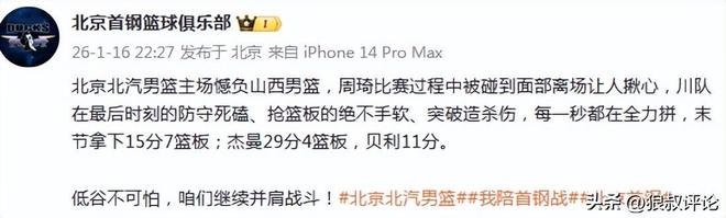 北京时间1月16日,CBA常规赛继续开打,北京84-90不敌山西,过去4场比赛,北京输了3场,而第四节崩盘引发外界的热议,大量的球迷冲到北京社媒评论区表达不满。北京官方社媒发文:北京北汽