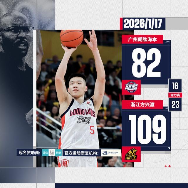 2025-26赛季CBA常规赛第十六轮客场负于广厦广州朗肽海本 82 : 109不敌浙江方兴渡数据方面:霍勒迪17分2篮板2助攻3抢断,威金顿16分1篮板5助攻,袁照耀10分8篮板1助攻,刘颜诚10分3