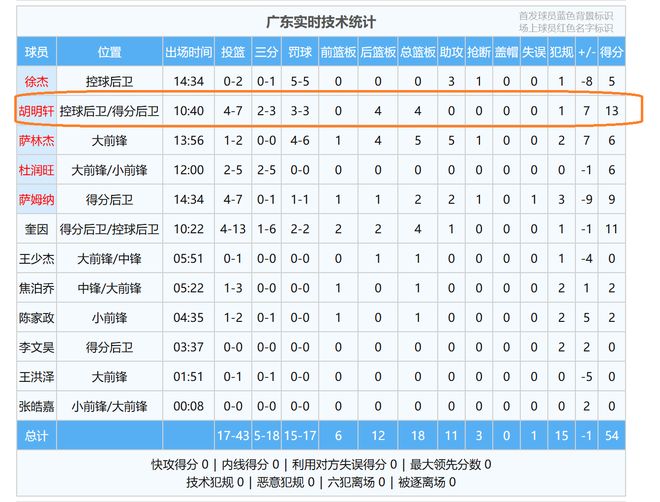 值得庆幸的是,广东队与北控队的比赛,胡明轩的状态回来了!在上半场比赛,胡明轩成为了广东队主要进攻点,只见胡明轩一次又一次冲到篮下得分,同时, 也是频频投进三分球,半场结束,胡明轩投篮7中4,其中,三分球3投2中,罚球3中3,砍下了13分4篮板的数据。投篮命中率,三分球命中率,都超过了五成,这对于胡明轩来讲,可以说是千年等一回了!真的是不容易呀。