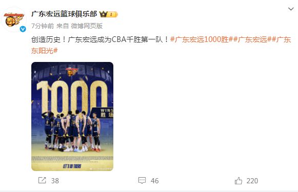 北京时间1月19日,伴随广东男篮轻松104-76大胜四川男篮,他们成功夺得队史第1000胜里程碑,成为CBA历史首支达成如此成就的球队。广东男篮官方晒出海报庆祝,他们本赛季剑指冲击第12