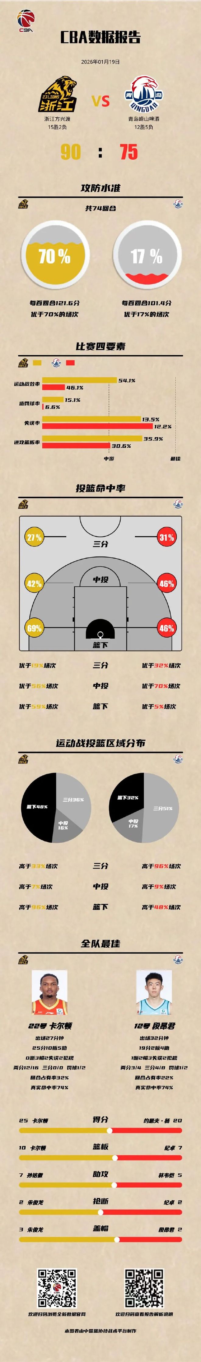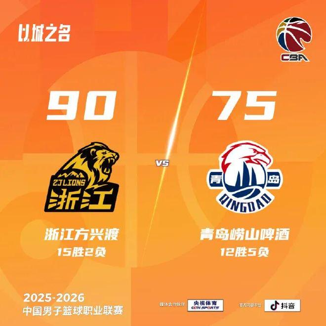 2026年1月19日,2025-2026赛季CBA联赛常规赛第17轮,青岛崂山啤酒客场对阵浙江方兴渡。本场比赛,韦瑟斯庞、米奇因伤缺席,段昂君、赵嘉义发挥出色,年轻球员敢打敢拼,全员均有进账,最