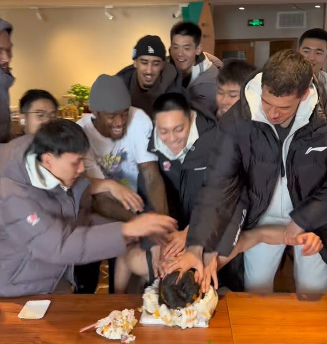 准备工作做完后,主力的人员还是胡明轩、徐杰、萨姆纳和杜润旺,他们狠狠将陈家政摁在蛋糕上。这个时候徐杰慢了一点,他当时还在品尝蛋糕呢,队友就下手了,最后才匆匆上手。