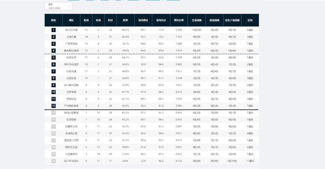 CBA25-26赛季第一阶段共23轮比赛。截至第17轮,联盟四支强队上海男篮、广厦男篮、广东男篮、北京男篮的成绩如下广厦男篮:15胜2负,胜率88.2%,排名第1上海男篮:14胜3负,胜率82.4%,排名
