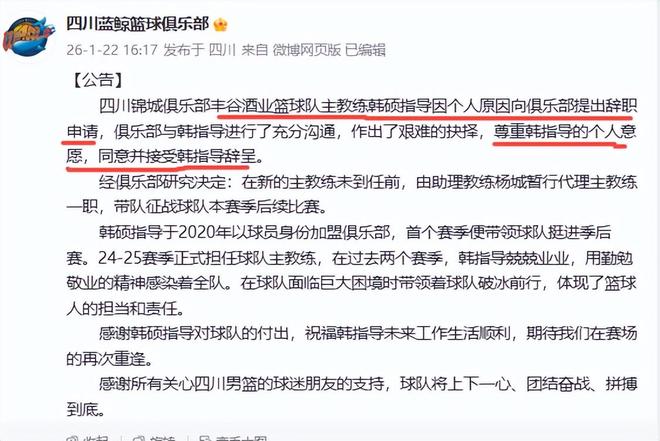 今天下午四点,CBA又一位主教练辞职,得到俱乐部的批准。没错,这就是四川蓝鲸篮球俱乐部主教练韩硕。四川蓝鲸篮球俱乐部官宣,主教练韩硕指导因个人原因向俱乐部提出辞职申请,俱乐