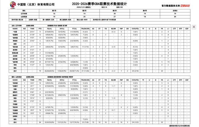 2025-2026赛季CBA常规赛第十八轮,辽宁本钢对阵山东高速的比赛于23日晚在辽宁体育馆进行,辽宁本钢队最终79:84憾负山东高速。