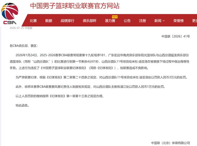 - 北京时间1月25日,CBA公司正式官宣了山西男篮被罚的消息,迪亚洛因做出侮辱性手势被罚款3万,主教练潘江被罚款1万...发表于: 01-26 08:53