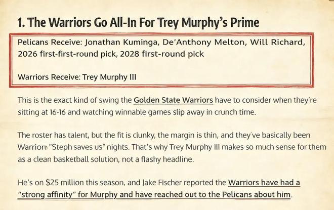 金州勇士,是和墨菲联系最密切的球队之一,双方曾多次出现在各种交易流言当中。在美媒《Fadeaway World》最新的报道中,勇士可能会推动一笔5换1的交易方案——送出库明加、梅尔顿、理查德以及2个首轮签,引入这位明星前锋。