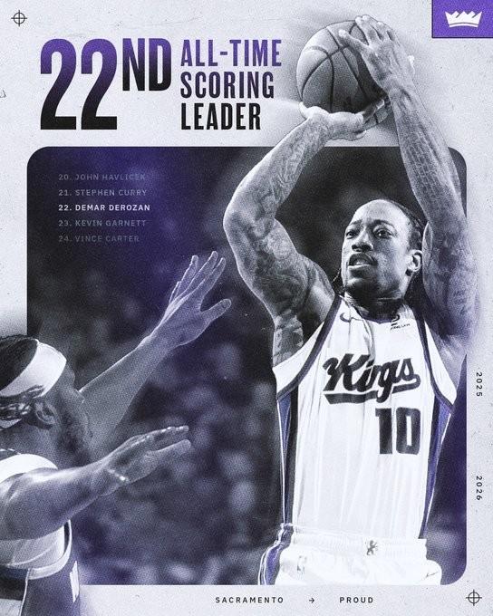 在比赛进行到第三节时,德罗赞三分命中得到本场的第22分,他也就此完成了在历史总得分榜上对于第22名凯文-加内特的超越。
