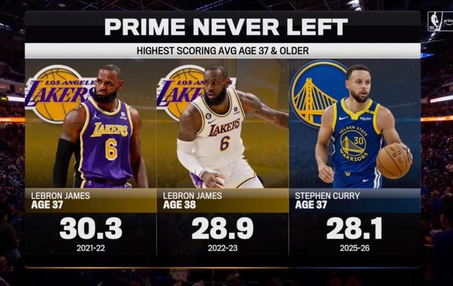 同样顶尖,37岁詹姆斯场均得分30.3分,高于37岁库里本赛季的28.1分