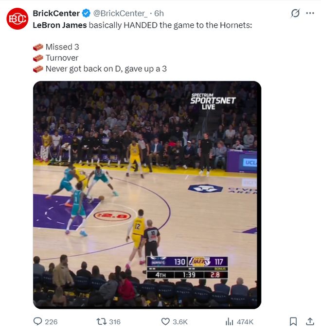 这场比赛勒布朗在末节一度将比分缩小到6分,但东契奇登场直接送了0-7,随后湖人再度被拉开到15分,詹姆斯连续的续命球后也出现了失误,末节詹姆斯6中4拿9分1篮板1抢断,但有美媒居然觉得是勒布朗导致湖人失利。