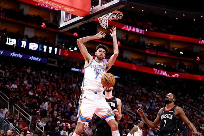 本场比赛中,雷霆的先发中锋切特-霍姆格伦(Chet Holmgren)算是在攻防两端都起到了关键的作用。切特全场出场28分49秒,投篮9中7,三分线外3中2,罚球3中2,得到了18分9篮板1助攻2抢断4盖帽的数据,还有4次犯规,正负值为+12。切特在进攻端虽然出手次数不多,但是简直是予取予求,展现出了全面的得分能力,轻轻松松打爆了火箭的内线。不仅如此,切特在防守端的表现更是可圈可点,他在篮板保护方面的表现值得肯定,他在护筐以及内线协防方面的表现同样出色。切特在本场比赛中算是靠着一己之力扛起了球队的内线大旗,他完完全全就是打爆了火箭的内线核心阿尔佩伦-申京(Alperen Sengun),这也是球队能够取得一场大胜的关键因素。