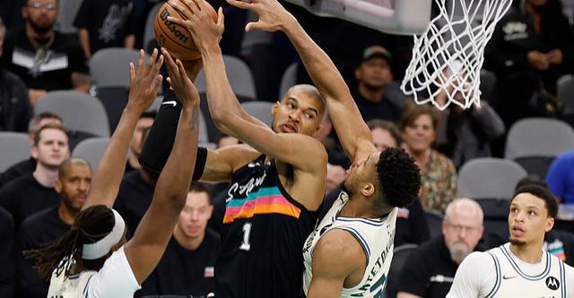 马刺队文班亚马开场被字母哥撞伤退后归来,仍三节打卡22分10板2帽,卡斯尔19分10助攻0失误,福克斯18分4助攻,尚帕涅13分11板,哈珀13分5助,科内特10分;