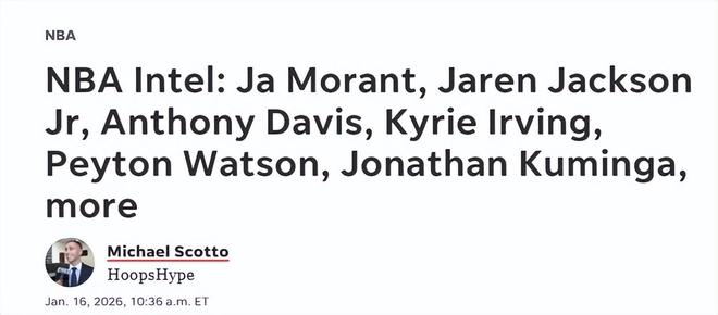 北京时间1月17日,离NBA交易截止日还有三周,HoopsHype汇总了关于灰熊球星贾-莫兰特、小贾伦-杰克逊,独行侠球星安东尼-戴维斯、凯里-欧文,掘金前锋佩顿-沃特森以及勇士前锋乔纳森