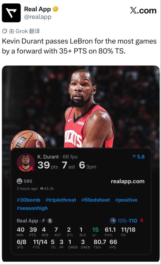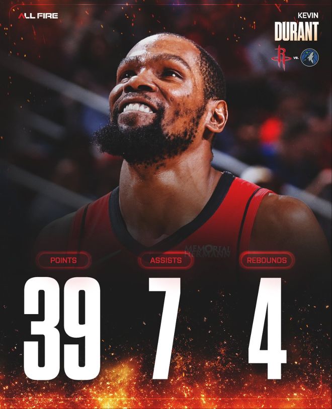 这场比赛后杜兰特又创造多项纪录:1.39分是杜兰特火箭生涯新高;