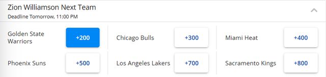 北京时间1月18日,锡安最新下家赔率出炉,勇士高居首位,他们成为了这位鹈鹕球星的头号热门下家。锡安下家赔率目前排在第1-6位的依次是勇士、公牛、热火、太阳、湖人和国王。随后