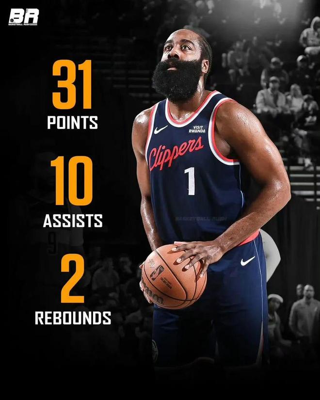 此役单核带队的哈登,出战42分钟,投篮27中10,其中三分15中2,收获31分10助两双数据。