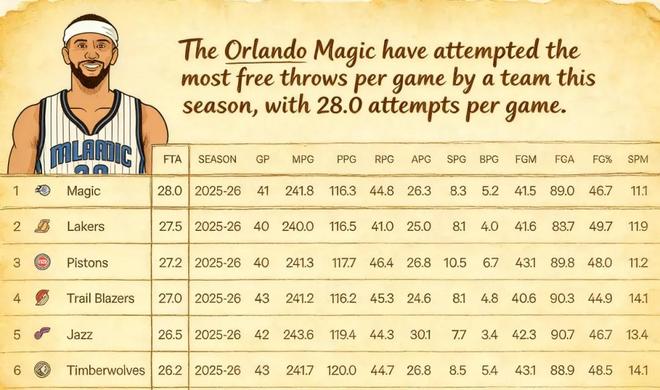 魔术场均罚球联盟最多,是因为他们的内线优势,瓦格纳和班切罗都有出色的低位进攻技术;湖人罚球多,是因为东契奇、里夫斯、詹姆斯出色的造犯规能力;活塞是因为坎宁安、杜伦领衔的青年军在前场的超强冲击力。