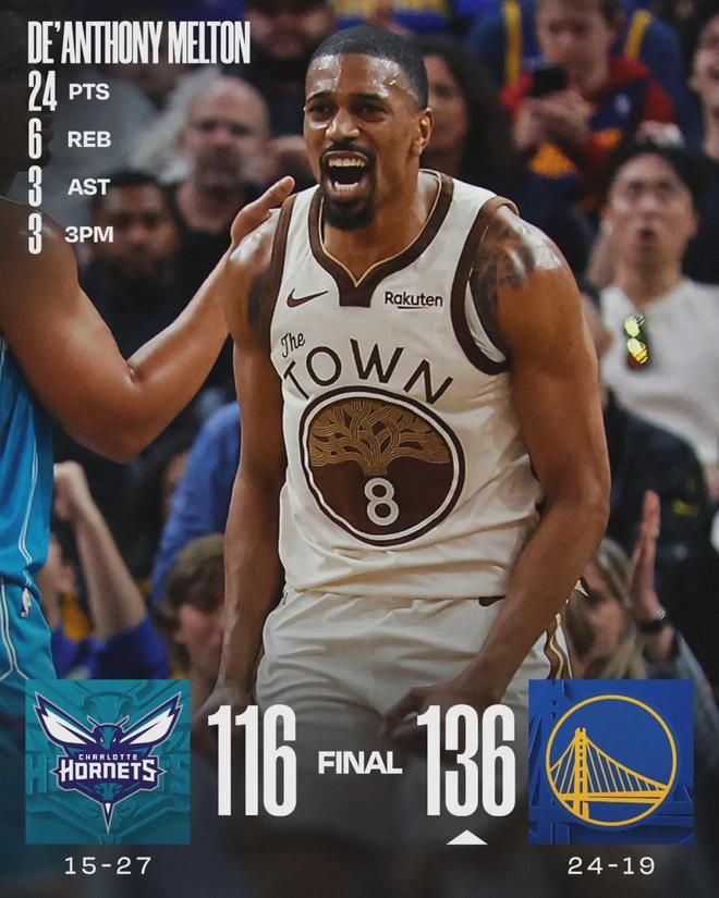 北京时间1月18日, NBA常规赛,勇士136-116大胜黄蜂。勇士后卫梅尔顿替补出战21分27秒,投篮16中8,三分6中3,罚球5中5,得到24分6篮板3助攻1抢断1失误2犯规,正负值+24。得分勇士全队最