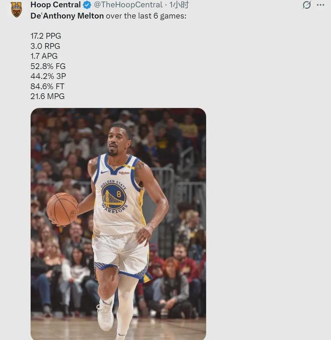 勇士过去15场比赛,梅尔顿出战了13场,勇士战绩为11胜2负;他缺席的两场比赛,勇士0胜2负。最近6场比赛,梅尔顿场均出战21.6分钟,能砍下17.2分3篮板1.7助攻,投篮命中率52.8%,三分命中率44.2%,罚球命中率84.6%。