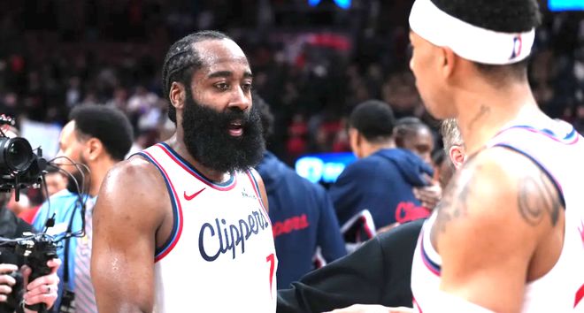 与伦纳德的高效形成鲜明对比的,是哈登的挣扎。在这波逆袭中哈登咬牙苦苦支撑,同期虽然场均数据来到24.8分3.8篮板7.8助攻,看似不俗,但39.6%的投篮命中率与30.9%的三分命中率均处于生涯低谷。更致命的是他的状态波动,防守端移动速度排名联盟倒数第二,与东契奇一同沦为防守漏洞;进攻端第三节时常“隐身”,数据显示,当比赛进入第三节时,哈登的两项命中率跌至32.8%+20.9%。而快船也陷入一个怪圈,球队要想赢球,伦纳德与哈登的得分总和必须稳定在55-60分区间。但这套“双核透支”的赢球模式,早已埋下隐患。