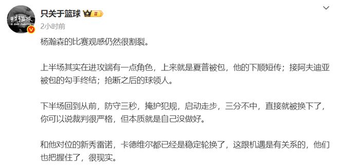 自媒体:杨瀚森的比赛观感很割裂,上半场进攻端还有一点角色,下半场就回到从前,防守三秒、掩护犯规、启动走步,三分不中就被换下。和他对位的新秀雷诺、卡德维尔已经是稳定内线轮换。