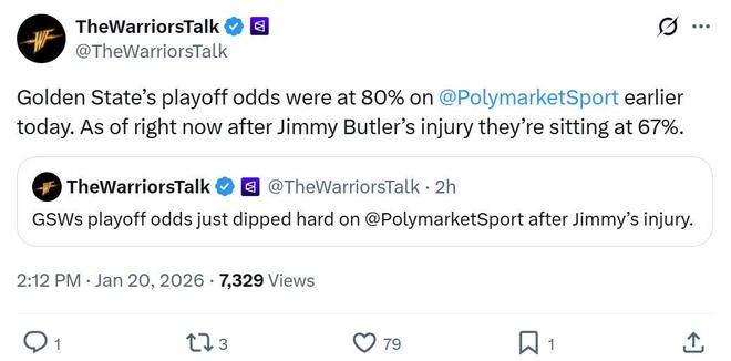 体育预测市场平台Polymarket Sports也在第一时间更新勇士进入季后赛的概率,在巴特勒受伤后这一数据从80%暴跌至67%,迅速下滑13个百分点。