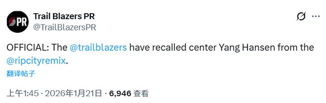 北京时间1月21日,开拓者官方宣布从混音队召回杨瀚森。另外,有媒体统计了开拓者队内所有球员的全明星球迷得票,杨瀚森排名第三。