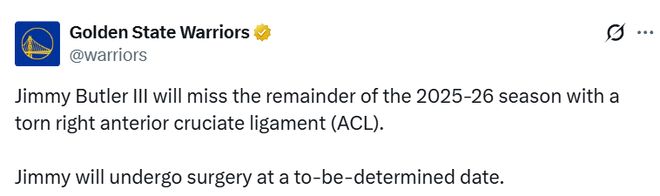 北京时间1月21日,勇士官方发布声明,前锋吉米-巴特勒因右膝前交叉韧带撕裂,将缺席2025-26赛季的剩余所有比赛。巴特勒是在昨日对阵迈阿密热火的比赛第三节还剩7分41秒时受伤的,勇
