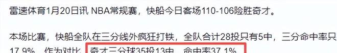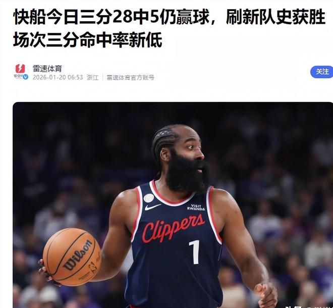 雷速体育(快船今日三分28中5仍赢球,刷新队史获胜场次三分命中率新低2026.01.20)