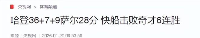 央视网(哈登36+7+9萨尔28分 快船击败奇才6连胜2026.01.20)