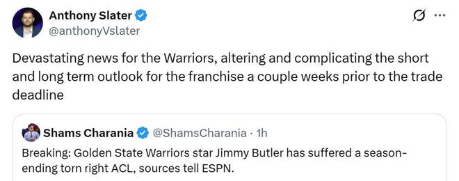 勇士队记Slater也跟进一针见血的指出,这对于勇士队是一个心碎的消息,也会让勇士队在交易截止日的短期与长期计划均发生复杂的改变。