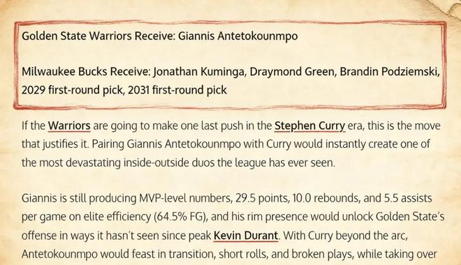 美媒《Fadeaway World》撰文建议,勇士可以打包将库明加、格林、波杰姆斯基、2029年以及2031年的首轮签送到雄鹿,换回这位两届常规赛MVP。