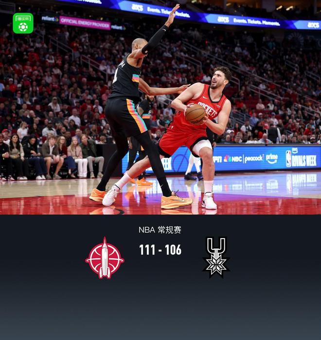 第四节火箭里德-谢泼德拿下12分,马刺凯尔登-约翰逊拿下4分,最终火箭111-106战胜马刺