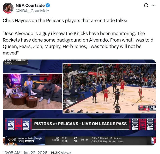 尼克斯队记Ian Begley也曾曝出球队一直都在等待鹈鹕队将阿尔瓦拉多正式摆上货架。