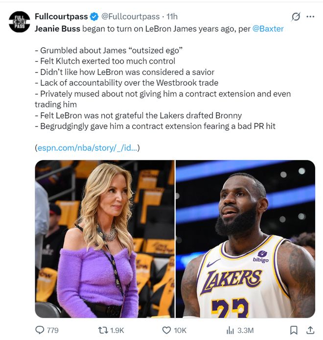 随后珍妮-巴斯委托TA记者萨姆-阿米克对ESPN的长文辟谣:鉴于LBJ为湖人所做的一切,他被卷入了我的家族纷争这太离谱了。ESPN的报道并不真实,对LBJ来说也太不公平。