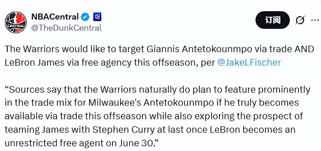 曝勇士今夏将追两大巨星!全力交易字母哥寻求签詹姆斯联手库里