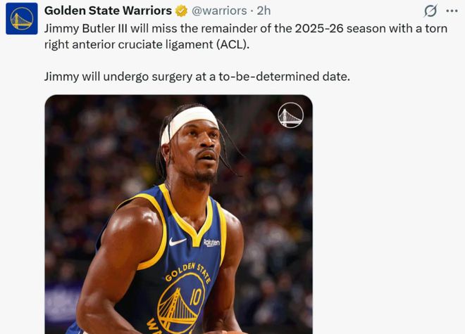 勇士本赛季最难受的画面:巴特勒高高跃起,伸手抢球,随后毫无预兆地倒在地板上。等队友把他拉起来后,巴特勒甚至还笑了一下,似乎和往常一样。但赛后没多久,消息就砸下来了:右膝前十字