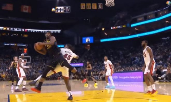 巴特勒高高跃起,伸手抢球,随后毫无预兆地倒在地板上。