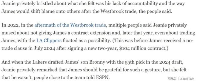 其五,在球队管理层面,珍妮·巴斯曾私下考虑不再为詹姆斯提供续约合同,甚至与相关人员讨论过交易他的可能性。这其中,她认为詹姆斯并未对湖人选中其子布朗尼·詹姆斯表现出足够的感激之情,这一因素也在一定程度上影响了她的决策考量。尽管最终珍妮·巴斯勉强同意与詹姆斯续约,但主要原因是担心拒绝续约会引发严重的公关危机,给球队形象带来负面影响。