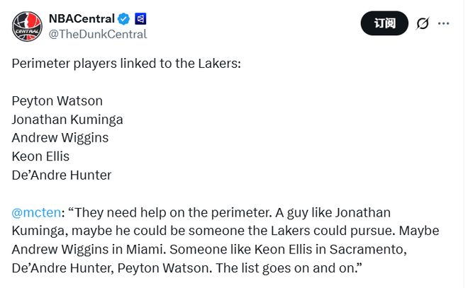 北京时间1月23日,湖人名记麦克米纳明在节目上谈到了球队的补强方向,提到了五个侧翼的名字。“湖人的外线急需补强。像乔纳森-库明加这样的球员,或许会是球队的追逐目标。还有可