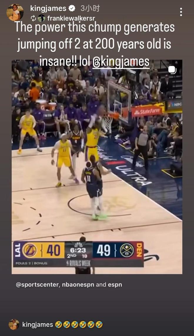 北京时间1月22日,詹姆斯在IG社媒上转发了朋友的动态。他的朋友晒出詹姆斯在对阵掘金比赛中的扣篮画面,并配文写道:“这老家伙都200岁了,还能双脚起跳爆发出这么恐怖的力量,太离谱