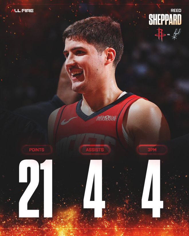 里德-谢泼德在对阵马刺一战中大放异彩,末节7中4+三分5中3+罚球2中1拿到12分,他成为火箭逆转马刺的第一奇兵,全场比赛拿到21分4助攻2篮板1抢断1盖帽4个三分球,谢泼德也因为这场比赛被火箭多位记者盛赞。