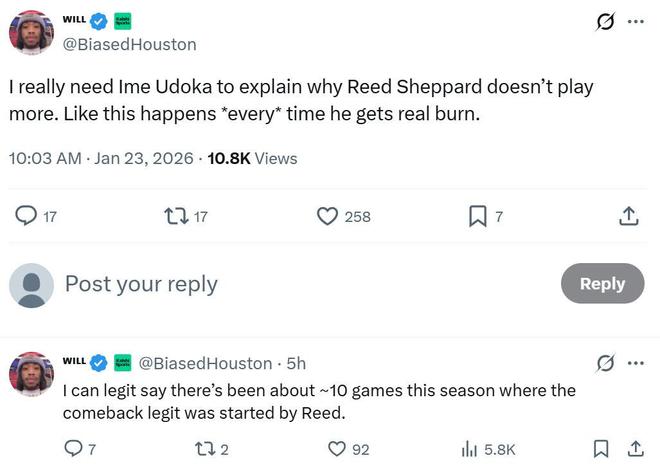 并不是只有Bradeaux一位火箭媒体人感到不解,大量火箭媒体人与当地资深球迷发声表达质疑,不理解为何谢泼德如此出色的三分手,却在进攻体系中完全无法获得任何战术安排。