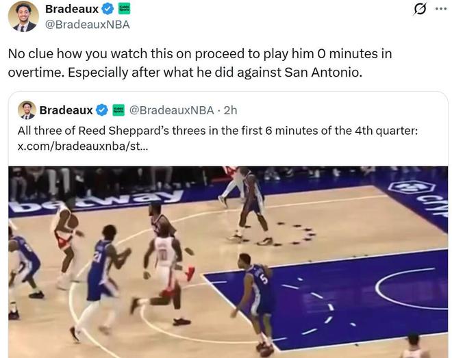 其中Bradeaux连发数条消息,先是称赞了谢泼德的表现,然后对谢泼德末节遭遇DNP感到不可思议:“我完全不明白你们(火箭教练组)在搞些什么东西,加时赛居然一分钟都不让谢泼德打,尤其是上一场对阵马刺他交出如此火爆表现之后。”