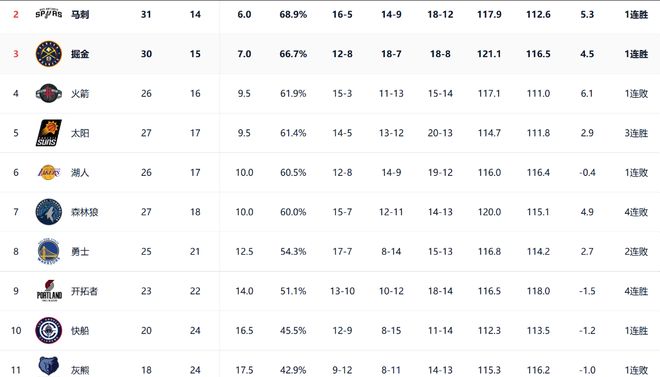 目前,除了马刺和掘金的位置比较稳,排名第二和第三之外,排名第四到第七的球队会随着比赛的战绩变化而不断变化,火箭在以122-128输给76人之后,目前和太阳战绩持平,接下来,如果太阳继续赢球,而火箭输球的话,那么双方的排名将会对调,并且相差一个胜场。