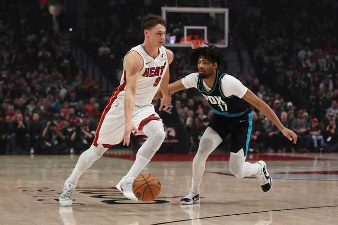 次节比赛,热火连续两节得分30+,开拓者被限制比首节少得到12分。开拓者扩大43-35领先优势,热火反扑追到差3分,开拓者一波7-0攻势扩大53-43领先。热火连追4分,乐福继续三分命中维持59-49领先优势,热火打出一波14-5攻势追分,开拓者单节26-32被追回6分,上半场结束开拓者仅64-63领先热火。前两节比赛,开拓者三分命中数11-5领先,杨瀚森未能登场,阿夫迪亚19分、卡马拉13分与乐福11分;阿德巴约17+6、维金斯11分与鲍威尔12分。