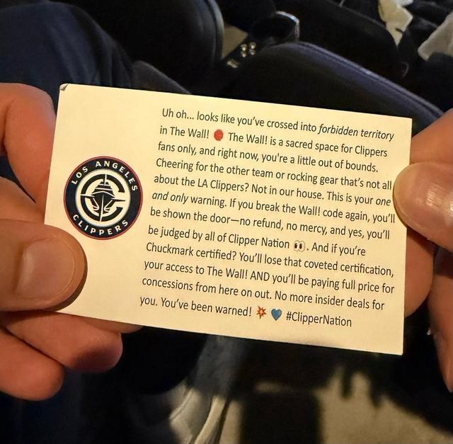 北京时间1月23日,在快船对阵湖人的洛城德比中,快船队取得了最后的胜利。赛后,美媒ClutchPoints晒出了一张图片,图片中是快船主场发放的“警告小卡片”,这是针对于湖人球迷强行坐